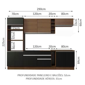 Outro grande diferencial desta cozinha é a profundidade maior, como uma cozinha planejada: 52 cm no balcão inferior e 31 cm nos aéreos. As medidas totais são: 290 cm de largura e 225 cm de altura.