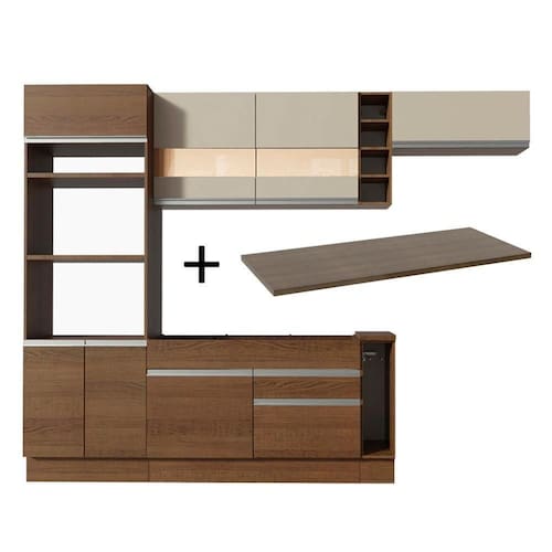 O balcão maior comporta pias de 120 cm x 52 cm e acompanha tampo em MDP no padrão amadeirado Rustic. Já o balcão menor segue com tampo de 80 cm x 52 cm que pode ser recortado para a colocação do cooktop. Todos os módulos inferiores possuem também pés reguláveis e rodapé removível. A torre possui espaço para forno e micro-ondas e permite a instalação de forno embutido.