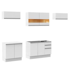 - Um balcão de pia de 120 cm de largura com duas portas e três gavetas, sendo uma maior (não acompanha tampo);