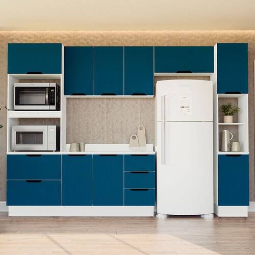 O(a) Cozinha Completa Meena 10 Portas 4 Gavetas 40250074 Branco/Azul - Politorno é produzido em MDF e MDP na escala de brilho Semi-Fosco, e possui um grau de dificuldade de montagem: Médio.