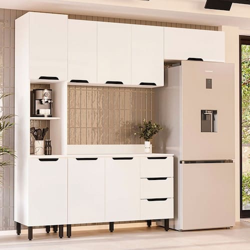 O(a) Cozinha Completa Meena 8 Portas 3 Gavetas 40250066 Branco - Politorno é produzido em MDF e MDP na escala de brilho Semi-Fosco, e possui um grau de dificuldade de montagem: Médio.