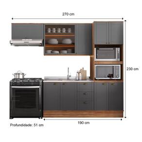 Especificações da composição: Medidas totais: Largura: 270 | Altura: 230 | Profundidade: 51 Peso total: 141 Matéria Prima: BP/MDF Acessórios: Puxadores metálicos Sistema de abertura: Dobradiças com amortecimento | Corrediças telescópicas