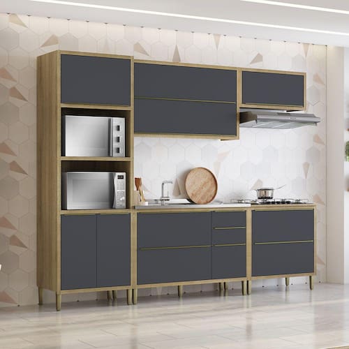 Características:Estrutura em MDPAcabamento em Pintura UV10 Portas articuladas03 GavetasPuxadores de plásticoDobradiças metálicasPés de PVCEspaços para eletrodomésticosAmplo espaço internoNÃO ACOMPANHA CUBA, NEM TAMPO.OBJETOS DECORATIVOS NÃO ACOMPANHAM O PRODUTO.Limpar utilizando apenas pano umedecido com água, nunca utilizar abrasivos ou esponjas de aço. Acompanha manual e todos os acessórios para montagem. Recomendamos que a montagem seja feita por um profissional. Garantia de 03 meses para eventuais defeitos de fabricação.Dimensões Totais:Altura: 214 cmLargura: 270,5 cm Profundidade Torre: 46,8 cmProfundidade Armário Aéreo 120 cm: 28,8 cmProfundidade Armário Aéreo Refrigerador: 28,8 cmProfundidade Balcão 80 cm: 49 cmProfundidade Balcão s/ Tampo 120 cm: 53,8 cmItens Inclusos:01 Paneleiro Torre Quente (2003708)01 Armário Aéreo 120 cm (2003702)01 Armário Aéreo Refrigerador (2003703)01 Balcão s/ Tampo 120 cm (2003706)01 Balcão 80 cm (2003705)Informações de Transporte:Peso Total: 180 Kg05 VolumesATENÇÃO, OBSERVAÇÕES IMPORTANTES.As imagens são meramente ilustrativas, não serão enviados objetos de decoração, eletrônicos e demais itens que não estejam especificados nos itens inclusos. É indispensável que seja feita a conferência do produto no ato da entrega e caso haja alguma divergência, seja feito o contato imediato com a loja e notificação no canhoto. Constatando defeito no ato da entrega o produto não deverá ser montado até tratativa com a loja. Não será efetuada a troca do produto após a montagem ter sido efetuada. A montagem é de total responsabilidade do cliente e defeitos na montagem serão tratadas como assistências. Os processos de pendências serão tratados mediante a fotos para analise e conferência da informação. As cores do produto podem variar de acordo com o seu monitor, a iluminação do ambiente em que você está e até mesmo a sua percepção visual. Não nos responsabilizamos, no ato da entrega, por subir escadas e elevadores. Eventuais despesas são de responsabilidade do cliente. Dúvidas serão tratadas via protocolo.