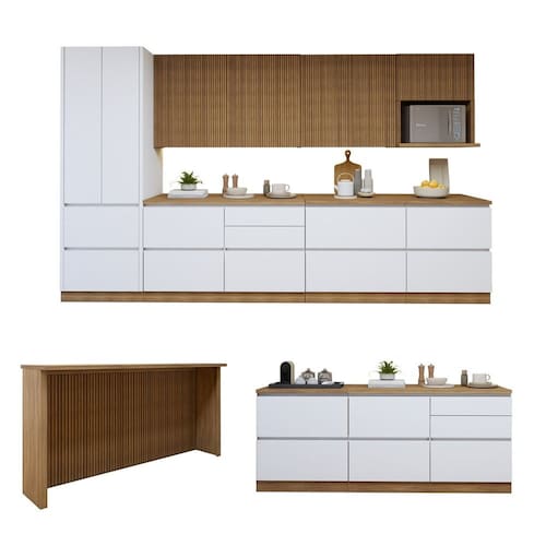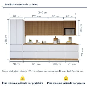 É uma cozinha resistente? Sim, o material MDF de alta qualidade garante resistência e durabilidade. Acabamento da Prateleira: Pintura Escala de Brilho da Prateleira: Fosco Acabamento da Gaveta: Impressão Escala de Brilho da Gaveta: Fosco Acabamento da Porta: Impressão Escala de Brilho da Porta: Fosco Acabamento dos Pés: Pintura Acompanha Tampo: Sim Altura dos Pés: 10 cm Altura Máxima dos Pés: 10.0000 Ambiente Principal: Cozinha Balcão Suporta Pia: Não codigo_ean: 7900288202437 Complexidade da Montagem: Alta: deve ser montado por um montador especializado Cor: Branco/Marrom Cor do Produto: Branco/Marrom Escala de Brilho: Fosco Espessura do Tampo: 30 mm Gaveta com Chave: Não Itens Inclusos: 1 Cozinha Completa, Kit Ferragens e Manual de Montagem Linha ou Coleção: Norten Manual de Montagem e Instalação: https://product-hub-prd.madeiramadeira.com.br/306490790/documents/f4607b16-5418-4f2e-bf85-ea8c99a6fcf6309331673217533575929624.pdf Marca: Nesher Móveis Material da Corrediça: Metálica Material da Dobradiça/Corrediça da Porta: Metálica Material da Gaveta: MDF Material da Porta: MDF Material da Prateleira: MDF Material do Tampo: MDF Material dos Pés: MDF Medida de cada item (A x L x P): Paneleiro 2 Portas 2 Gavetas 70 Cm A: 228 Cm P: 52 Cm L: 70 Cm Arm. Micro-ondas 1 Porta Basc. 70 Cm A: 80 Cm P: 42 Cm L: 70 Cm Armário Aéreo 2 Portas 120 Cm A: 80 Cm P: 32 Cm L: 120 Cm Balcão 1 Porta 4 Gavetas 120 Cm A: 91 Cm P: 52 Cm L: 120 Cm Balcão 1 Porta 1 Gaveta 80 Cm A: 91 Cm P: 52 Cm L: 80 Cm Balcão 1 Porta 1 Gaveta 70 Cm A: 91 Cm P: 52 Cm L: 70 Cm Armário Aéreo 2 Portas 80cm A: 80 Cm P: 32 Cm L: 80 Cm Balcão 1 Porta 4 Gavetas 120 Cm A: 91 Cm P: 52 Cm L: 120 Cm Balcão 1 Porta 1 Gaveta 80 Cm A: 91 Cm P: 52 Cm L: 80 Cm Painel De Ilhacanelado 200 Cma: 100 Cmp: 35,5 Cml: 200 Cm modular: Sim Necessita Montagem: Sim O Balcão Acompanha Pia: Não Origem do Produto: Nacional Pés Reguláveis: Não Peso: 476,76 kg Peso Máximo por Gaveta: 5 kg Peso Máximo por Prateleira: 10 kg Possui Pés: Rodapé Possui Portas: Sim Possui Prateleiras: Sim Possui recorte para Cooktop: Não Possui Rodízio: Não Possui Vidro: Não Produto Montado: Sim Recomendações de Uso, Manutenção e Limpeza: Utilizar pano macio levemente umedecido e na sequencia pano macio seco. Sapatas Niveladoras: Não Sistema de Montagem: Parafusos. Tamanho Indicado da Pia: . Tipo de Corrediça da Gaveta: Metálica Telescópica Tipo de Dobradiça da Porta: 35 mm Tipo de Dobradiça/Corrediça da Porta: 35 mm Tipo de Puxador da Gaveta: Embutido Tipo de Puxador da Porta: Embutido Marca: Não Informado