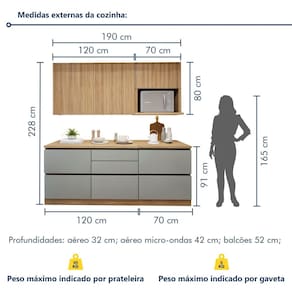É um armário resistente? Sim, o material MDF de alta qualidade garante resistência. Acabamento da Prateleira: Pintura Escala de Brilho da Prateleira: Fosco Acabamento da Gaveta: Impressão Escala de Brilho da Gaveta: Fosco Acabamento da Porta: Impressão Escala de Brilho da Porta: Fosco Acabamento dos Pés: Pintura Acompanha Tampo: Sim Altura dos Pés: 10 cm Altura Máxima dos Pés: 10.0000 Ambiente Principal: Cozinha Balcão Suporta Pia: Não codigo_ean: 7900288203007 Complexidade da Montagem: Alta: deve ser montado por um montador especializado Cor: Marrom/Verde Cor do Produto: Marrom/Verde Escala de Brilho: Fosco Espessura do Tampo: 30 mm Gaveta com Chave: Não Itens Inclusos: 1 Cozinha Completa, Kit Ferragens e Manual de Montagem Linha ou Coleção: Norten Manual de Montagem e Instalação: https://product-hub-prd.madeiramadeira.com.br/980636253/documents/372c646a-c157-43f9-800f-2268047bc08b309337173217533584887143.pdf Marca: Nesher Móveis Material da Corrediça: Metálica Material da Dobradiça/Corrediça da Porta: Metálica Material da Gaveta: MDF Material da Porta: MDF Material da Prateleira: MDF Material do Tampo: MDF Material dos Pés: MDF Medida de cada item (A x L x P): Balcão 1 Porta 4 Gavetas 120 Cm A: 91 Cm P: 52 Cm L: 120 Cm Armário Aéreo 2 Portas 120 Cm A: 80 Cm P: 32 Cm L: 120 Cm Arm. Micro-ondas 1 Porta Basc. 70 Cm A: 80 Cm P: 42 Cm L: 70 Cm Balcão 1 Porta 1 Gaveta 70 Cm A: 91 Cm P: 52 Cm L: 70 Cm modular: Sim Necessita Montagem: Sim O Balcão Acompanha Pia: Não Origem do Produto: Nacional Pés Reguláveis: Não Peso: 160,08 kg Peso Máximo por Gaveta: 5 kg Peso Máximo por Prateleira: 10 kg Possui Pés: Rodapé Possui Portas: Sim Possui Prateleiras: Sim Possui recorte para Cooktop: Não Possui Rodízio: Não Possui Vidro: Não Produto Montado: Sim Recomendações de Uso, Manutenção e Limpeza: Utilizar pano macio levemente umedecido e na sequencia pano macio seco. Sapatas Niveladoras: Não Sistema de Montagem: Parafusos. Tamanho Indicado da Pia: . Tipo de Corrediça da Gaveta: Metálica Telescópica Tipo de Dobradiça da Porta: 35 mm Tipo de Dobradiça/Corrediça da Porta: 35 mm Tipo de Puxador da Gaveta: Embutido Tipo de Puxador da Porta: Embutido Marca: Não Informado