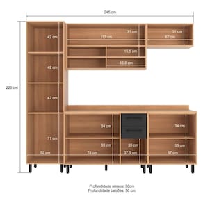 Altura: 220cm | Largura: 245cm | Profundidade: 50cm (balcões) - 30cm (armários aéreos)