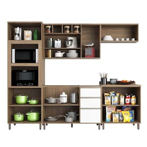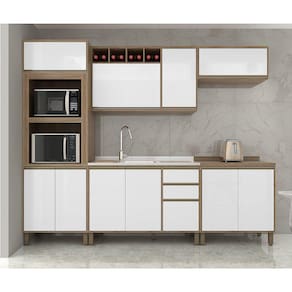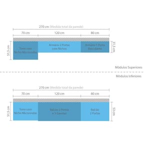 Uma cozinha modulada linda, completa, para deixar seu ambiente super aconchegante e requintado. Composta por 5 peças cuidadosamente pensadas para sua organização. As portas embutidas remetem ao planejado, com acabamento impecável. Os módulos são montados individualmente e permite a instalação da forma que melhor se adeque ao seu espaço. Contém uma torre com espaços para forno e micro-ondas, para manter tudo bem organizado. Para este ambiente utilizamos como proposta 270cm de parede.