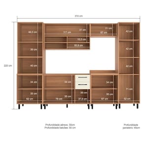 Altura: 220cm | Largura: 310cm | Profundidade: 50cm (balcões) - 45cm (paneleiro) - 30cm (armários aéreos)
