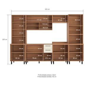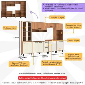 Dimensões do produto montado: Altura: 220cm | Largura: 320cm | Profundidade: 50cm (balcões) - 30cm (armários aéreos) *Você pode consultar as medidas detalhadas na imagem técnica do produto.