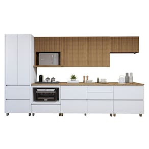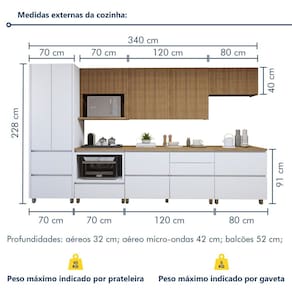 É uma cozinha resistente? Sim, o material MDF de alta qualidade garante resistência e durabilidade. Acabamento da Prateleira: Pintura Escala de Brilho da Prateleira: Fosco Acabamento da Gaveta: Impressão Escala de Brilho da Gaveta: Fosco Acabamento da Porta: Impressão Escala de Brilho da Porta: Fosco Acabamento dos Pés: Pintura Acompanha Tampo: Sim Altura dos Pés: 10 cm Altura Máxima dos Pés: 10.0000 Ambiente Principal: Cozinha Balcão Suporta Pia: Não codigo_ean: 7900288201553 Complexidade da Montagem: Alta: deve ser montado por um montador especializado Cor: Branco/Marrom Cor do Produto: Branco/Marrom Escala de Brilho: Fosco Espessura do Tampo: 30 mm Gaveta com Chave: Não Itens Inclusos: 1 Cozinha Completa, Kit Ferragem e Manual de Montagem. Linha ou Coleção: Norten Manual de Montagem e Instalação: https://product-hub-prd.madeiramadeira.com.br/859599995/documents/6343da66-6c89-4a04-bc53-b002df00968e309335373217533583612697.pdf Marca: Nesher Móveis Material da Corrediça: Metálica Material da Dobradiça/Corrediça da Porta: Metálica Material da Gaveta: MDF Material da Porta: MDF Material da Prateleira: MDF Material do Tampo: MDF Material dos Pés: ABS Medida de cada item (A x L x P): Paneleiro 2 Portas 2 Gavetas 70 Cm A: 228 Cm P: 52 Cm L: 70 Cm Armário Micro-ondas 1 Porta Basc. 70 Cm A: 80 Cm P: 42 Cm L: 70 Cm Armário Aéreo 2 Portas 120 Cm A: 80 Cm P: 32 Cm L: 120 Cm Aéreo Geladeira 1 Porta Basc. 80 Cm A: 40 Cm P: 32 Cm L: 80 Cm Balcão Forno 1 Gaveta 70 Cm A: 91 Cm P: 52 Cm L: 70 Cm Balcão 1 Porta 4 Gavetas 120 Cm A: 91 Cm P: 52 Cm L: 120 Cm Balcão 1 Porta 1 Gaveta 80 Cm A: 91 Cm P: 52 Cm L: 80 Cm modular: Sim Necessita Montagem: Sim O Balcão Acompanha Pia: Não Origem do Produto: Nacional Pés Reguláveis: Sim Peso: 285,4 kg Peso Máximo por Gaveta: 5 kg Peso Máximo por Prateleira: 10 kg Possui Pés: 17 Possui Portas: Sim Possui Prateleiras: Sim Possui recorte para Cooktop: Não Possui Rodízio: Não Possui Vidro: Não Produto Montado: Sim Recomendações de Uso, Manutenção e Limpeza: Utilizar pano macio levemente umedecido e na sequencia pano macio seco. Sapatas Niveladoras: Sim Sistema de Montagem: Parafusos. Tamanho Indicado da Pia: . Tipo de Corrediça da Gaveta: Metálica Telescópica Tipo de Dobradiça da Porta: 35 mm Tipo de Dobradiça/Corrediça da Porta: 35 mm Tipo de Puxador da Gaveta: Embutido Tipo de Puxador da Porta: Embutido Marca: Não Informado