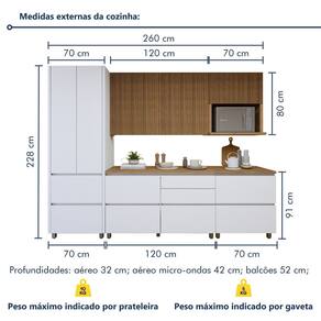 É uma cozinha resistente? Sim, o material MDF de alta qualidade garante resistência e durabilidade. Acabamento da Prateleira: Pintura Escala de Brilho da Prateleira: Fosco Acabamento da Gaveta: Impressão Escala de Brilho da Gaveta: Fosco Acabamento da Porta: Impressão Escala de Brilho da Porta: Fosco Acabamento dos Pés: Pintura Acompanha Tampo: Sim Altura dos Pés: 10 cm Altura Máxima dos Pés: 10.0000 Ambiente Principal: Cozinha Balcão Suporta Pia: Não codigo_ean: 7900288201003 Complexidade da Montagem: Alta: deve ser montado por um montador especializado Cor: Branco/Marrom Cor do Produto: Branco/Marrom Escala de Brilho: Fosco Espessura do Tampo: 30 mm Gaveta com Chave: Não Itens Inclusos: 1 Cozinha Completa, Kit Ferragens e Manual de Montagem Linha ou Coleção: Norten Manual de Montagem e Instalação: https://product-hub-prd.madeiramadeira.com.br/450238523/documents/90936e26-e4e8-4049-b2b4-f8a575924bf4309332873217533576787389.pdf Marca: Nesher Móveis Material da Corrediça: Metálica Material da Dobradiça/Corrediça da Porta: Metálica Material da Gaveta: MDF Material da Porta: MDF Material da Prateleira: MDF Material do Tampo: MDF Material dos Pés: ABS Medida de cada item (A x L x P): Paneleiro 2 Portas 2 Gavetas 70 Cm A: 228 Cm P: 52 Cm L: 70 Cm armário Aéreo 2 Portas 120 Cm A: 80 Cm P: 32 Cm L: 120 Cm Arm. Micro-ondas 1 Porta Basc. 70 Cm A: 80 Cm P: 42 Cm L: 70 Cm 2 - Balcão 1 Porta 4 Gavetas 120 Cm A: 91 Cm P: 52 Cm L: 120 Cm Balcão 1 Porta 1 Gaveta 80 Cm A: 91 Cm P: 52 Cm L: 80 Cm Balcão 1 Porta 1 Gaveta 70 Cm A: 91 Cm P: 52 Cm L: 70 Cm Painel De Ilha Canelado 200 Cm A: 100 Cm P: 35,5 Cm L: 200 Cm modular: Sim Necessita Montagem: Sim O Balcão Acompanha Pia: Não Origem do Produto: Nacional Pés Reguláveis: Sim Peso: 392,4 kg Peso Máximo por Gaveta: 5 kg Peso Máximo por Prateleira: 10 kg Possui Pés: 22 Possui Portas: Sim Possui Prateleiras: Sim Possui recorte para Cooktop: Não Possui Rodízio: Não Possui Vidro: Não Produto Montado: Sim Recomendações de Uso, Manutenção e Limpeza: Utilizar pano macio levemente umedecido e na sequencia pano macio seco. Sapatas Niveladoras: Sim Sistema de Montagem: Parafusos. Tamanho Indicado da Pia: . Tipo de Corrediça da Gaveta: Metálica Telescópica Tipo de Dobradiça da Porta: 35 mm Tipo de Dobradiça/Corrediça da Porta: 35 mm Tipo de Puxador da Gaveta: Embutido Tipo de Puxador da Porta: Embutido Marca: Não Informado