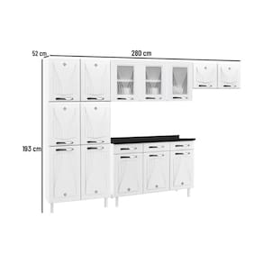 Dimensões do Produto Montado: Cozinha - Altura: 193cm | Largura: 280cm | Profundidade: 52cm (Balcão) - 29cm (Aéreos) *Você pode consultar as medidas detalhadas na imagem técnica do produto.