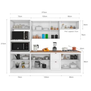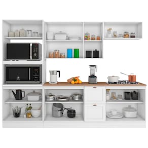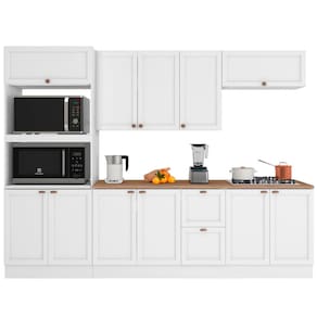 Composta por: torre quente, a?reo triplo, a?reo geladeira, balc?o 1,20m com tampo e balc?o 0,80m com tampo. Produto com portas almofadadas/molduradas em MDF inspirada nas cl?ssicas cozinhas americanas, espa?o para forno e micro-ondas, prateleiras, corredi?as telesc?picas, dobradi?as refor?adas de 35mm, pist?o a g?s, puxadores modelo retro em pol?mero com acabamento em alta cobertura, p?s em PVC regul?veis ao piso de 14,5 cm que permitem o nivelamento perfeito, acompanha rodap?s remov?veis com presilhas modelo click que facilita na hora de fazer a limpeza. Estrutura em MDP Perffect Touch de maior resist?ncia e com prote??o Bacterban que inibe a prolifera??o de fungos e bact?rias na superf?cie do m?vel.