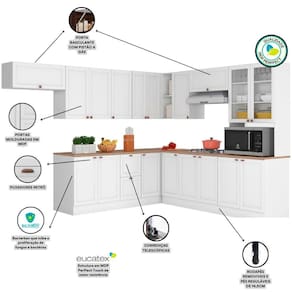 Amplo espa?o interno, pist?o a g?s nos m?dulos a?reos basculantes, balc?o 1,20m c/ tampo que pode ser utilizado com pia de 1,20mx0,50m, balc?o de 0,80m ideal para cooktop com prateleira remov?vel podendo acomodar objetos maiores, paneleiro com nichos para forno e micro-ondas e portas em vidro incolor, gavetas com corredi?as telesc?picas, dobradi?as refor?adas de 35mm, puxadores modelo retro em pol?mero, p?s em PVC 14,5cm regul?veis e rodap?s remov?veis com presilhas modelo click que facilita na hora de fazer a limpeza.