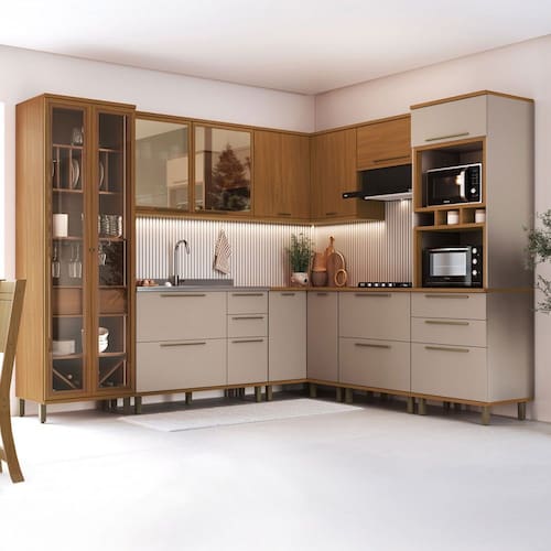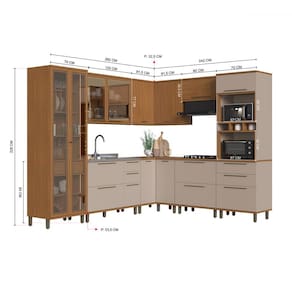 O(a) Cozinha Completa Munique 14 Portas 7 Gavetas com Vidro 6154.195 Freijó/Camurça - Indékes é produzido em MDP na escala de brilho Fosco, e possui um grau de dificuldade de montagem: Médio.