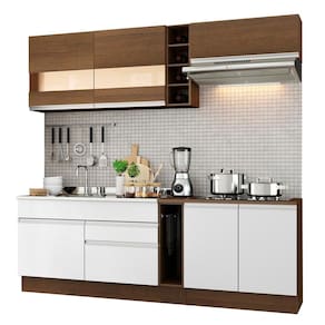 - Itens inclusos: Um Balcão de Pia com duas gavetas e uma porta (Não acompanha tampo deste balcão) | Um Porta-Panos com tampo em MDP | Um Balcão com duas portas e tampo em MDP | Um Armário Aéreo com duas portas com detalhe em vidro reflex | Um Armário Aéreo com uma porta basculante | Uma Adega