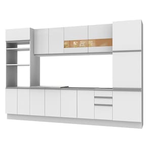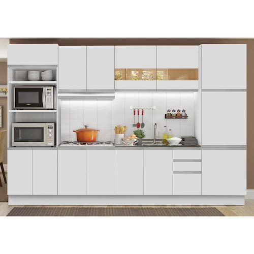 Itens inclusos: - Uma (1) coluna de 70cm com nichos para forno e micro-ondas, duas (2) portas batentes e uma (1) porta basculante - Um (1) balcão inferior de 80cm com duas portas e tampo - Um (1) aéreo de 80cm com duas (2) portas - Um (1) balcão de pia de 120cm com duas (2) portas e três (3) gavetas, sendo uma maior (não acompanha o tampo deste balcão) - Um (1) aéreo de 120cm com duas (2) portas com detalhe em vidro reflex - Um (1) paneleiro de 60cm com 3 portas