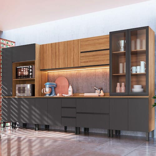 O(a) Cozinha Completa Plátano 16 Portas 5 Gavetas Montana/Grafite - Quidita Móveis é produzido em MDP na escala de brilho Semi-Brilho, e possui um grau de dificuldade de montagem: Médio.