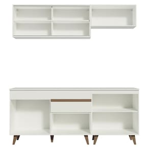 Para completar, ambos os balcões acompanham tampos, que podem ser removidos para colocação de pia e cooktop. Além disso, os pés em madeira são um charme a parte que além de beleza, conferem firmeza e resistência ao móvel.