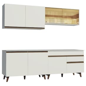 As medidas totais são: 240 cm de largura e 210 cm de altura. A profundidade é de cozinha planejada: 52 cm nos balcões e 31 cm nos aéreos.