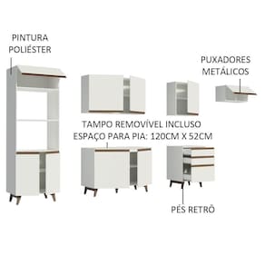 - O acabamento da cozinha é branco, feito em Pintura Poliéster ecológica de alta resistência, que dá maior destaque à tonalidade e protege o móvel