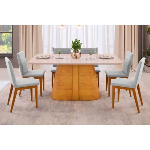 Sala de Jantar Completa Ryze Tampo Madeirado c/ Vidro Curvo 180x100cm e 6 Cadeiras Sofia Cedro/Off White - Ipe/Linho Neve - DJ Móveis Abaixo segue os produtos do KIT: Sala de Jantar Completa Ryze Tampo Madeirado c/ Vidro Curvo 180x100cm e 6 Cadeiras Sofia Cedro/Off White - Ipe/Linho Neve - DJ Móveis