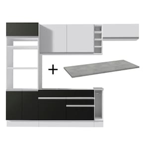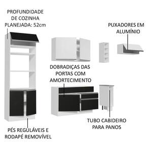 - Itens inclusos: Uma (1) torre-quente com dois (2) nichos para forno e micro-ondas, um (1) nicho menor e três (3) portas sendo uma (1) basculante | Um (1) balcão de pia com duas (2) gavetas e uma (1) porta e tampo em MDP | Um (1) balcão porta panos com tampo em MDP | Um (1) aéreo com duas (2) portas com detalhe em vidro reflex | Uma (1) mini adega | Um (1) aéreo com uma (1) porta basculante