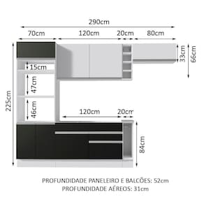 - Dimensão total do produto (AxL): 225 x 290cm | Profundidade balcões e paneleiro 52cm e aéreos 31cm