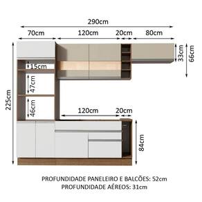 - Dimensão total do produto (AxL): 225 x 290cm | Profundidade balcões e paneleiro 52cm e aéreos 31cm