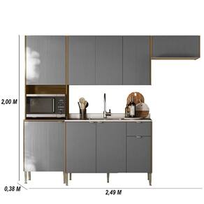 A cozinha é produzida em MDP de 12 e 15 mm e conta com 6 portas (sendo 1 basculante), prateleiras internas, nicho para micro-ondas, suporte para gás e passa-fio, facilitando a organização e deixando os cabos mais discretos. O design fica ainda mais moderno com portas superiores passantes e porta inferior com acabamento embutido.