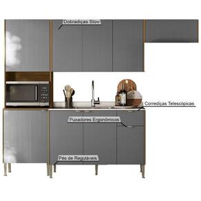 Para maior conforto no uso, o conjunto conta com dobradiças com amortecedor (fechamento suave), puxadores ergonômicos em alumínio e pés reguláveis em plástico resistente, ajudando no nivelamento conforme o piso. A gaveta do balcão utiliza corrediças telescópicas 100% metálicas, garantindo deslizamento mais firme e durável. O acabamento final é em pintura com secagem em luzes UV, que melhora a proteção e o aspecto do móvel.