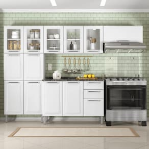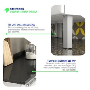 Fechamento suave com Dobradiças Slow Motion: Mais conforto e silêncio no uso das portas. Corrediças Telescópicas: Acesso completo às gavetas com deslizamento leve e eficiente. Pés com Sapata Regulável: Ajuste de até 25mm, garantindo estabilidade e em qualquer piso. Tampo Resistente a Altas Temperaturas (até 120C): Beleza e funcionalidade com tampo em fórmica ou granito que suporta altas temperaturas. Abertura suave com Pistão a Gás: Portas que se abrem de maneira fácil e suave, proporcionando maior comodidade. Puxadores em ABS: Resistentes e de fácil manuseio, complementando o design moderno e durável.