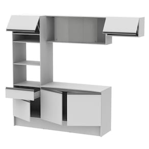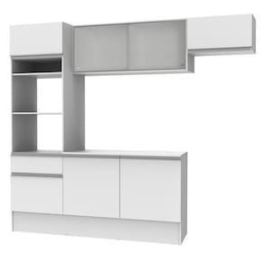 - Uma (1) torre com nichos para forno e micro-ondas, com uma (1) gaveta e duas (2) portas, sendo uma basculante com um (1) balcão agregado de 120 cm com duas (2) portas
