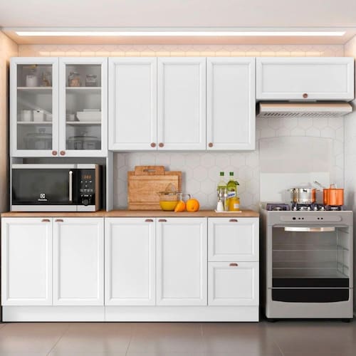 Cozinha Completa Unna 4 Peças 10 Portas 2 Gavetas Poliman Móveis Branco A Cozinha Modulada Completa 10 portas 2 gavetas com paneleiro duplo micro-ondas e uma composicao elegante que esbanja praticidade. Produto com portas almofadadas/molduradas em MDF inspirada nas classicas cozinhas . Amplo espaco interno, paneleiro para micro-ondas com 2 portas molduradas com vidro transparente, prateleiras no paneleiro, aereo triplo e balcao, balcao c/ tampo para pia de 1,20x0,50m, gavetas com corredicas telescopicas, dobradicas reforcadas de 35mm, aereo 1 porta basculante com pistao a gas que pode ser utilizado sobre geladeira ou fogao, puxadores modelo retro em polimero, pes em PVC 14,5cm regulaveis e rodapes removiveis com presilhas modelo click que facilita na hora de fazer a limpeza. Estrutura em MDP Perffect Touch de maior resistencia e com protecao Bacterban que inibe a proliferacao de fungos e bacterias na superficie do movel. Produto ecologicamente correto com embalagens preparadas para evitar e permitir que o produto chegue em perfeito estado em sua casa.