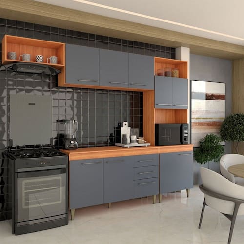 O(a) Cozinha Completa Vanessa 9 Portas 2 Gavetas Cinamomo/Grafite - Loja é produzido em MDP na escala de brilho Semi-Brilho, e possui um grau de dificuldade de montagem: Médio.