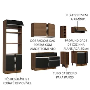 - Itens inclusos: Uma (1) torre-quente com dois (2) nichos para forno e micro-ondas e três (3) portas sendo uma (1) basculante | Um (1) balcão de pia com duas (2) gavetas e uma (1) porta e tampo em MDP | Um (1) porta panos | Um (1) balcão com duas (2) portas e tampo em MDP | Um (1) aéreo com duas (2) portas | Um (1) aéreo com uma (1) porta basculante | Uma (1) adega