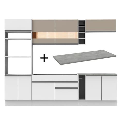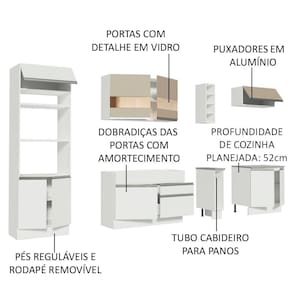 - Itens inclusos: 1 porta fornos com dois nichos para forno e micro-ondas; 3 portas sendo uma basculante; 1 balcão de pia com duas gavetas, uma porta e tampo em MDP; 1 porta panos; 1 balcão com duas portas e tampo em MDP; 1 aéreo com duas portas com detalhe em vidro; 1 aéreo com uma porta basculante; 1 mini adega
