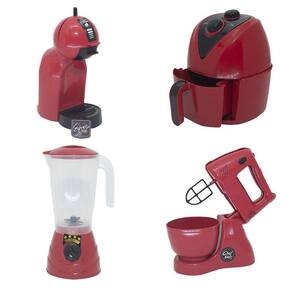 Esse kit contém air fryer, liquidificador, batedeira, cafeteira, jarra com copo, fogão, panelas, mercadinho completo, panelinha de pressão, microondas, xícara com colher e pires, bulê, cestinha com frutas e legumes, louça