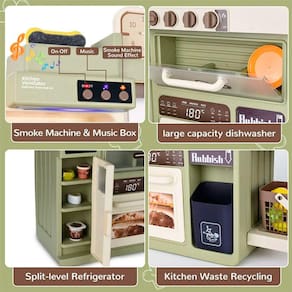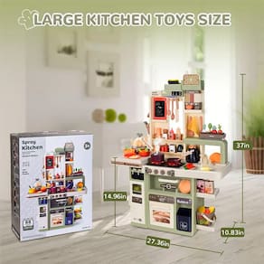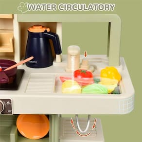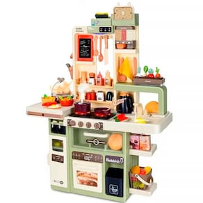 As crianças vão adorar brincar de culinária com a Cozinha de brinquedo super moderna e educativa! Gire o botão do fogão e a panela sairá vapor, acenderá luz e emitirá som que simula um fogão real! Simule a cena da culinária e desenvolva o interesse em cozinhar nas crianças. A torneira solta água de verdade! A criança pode experimentar lavar a louça de uma forma divertida. Várias formas de abrir a porta, como abertura deslizante e plana. Use o quadro negro para as crianças escrever o menu do dia. Usando a cesta, prateleira e armário ajuda no desenvolvimento da noção espacial. Estimule nas crianças a percepção visual e coordenação viso motora ao manusear os objetos da cozinha. A interação com estes brinquedos promove o contato com a realidade através do imaginário, deixando a tecnologia de lado e apostando na criatividade. Brincar de cozinhar com uma criança será divertido, muito interessante e educativo.