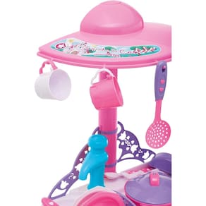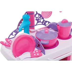 Cheia de estilo e funcionalidades a cozinha do castelo dá asas a imaginação das crianças. Permitindo que elas criem, simulem e reproduzam situações do dia a dia. O charme da cozinha fica por conta do fogão superior com peças de encaixe, como em um fogão a lenha de verdade! Outro detalhe é a coifa multiuso, nela é possível pendurar os utensílios da cozinha. E para completar a brincadeira, a cozinha acompanha vários acessórios, como pratos, xícaras, talheres, panela, leiteira com tampa, além de possuir a pia com torneira que sai água de verdade, conta ainda com mais um forno na parte inferior, com gaveta.