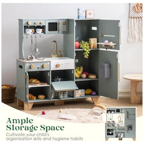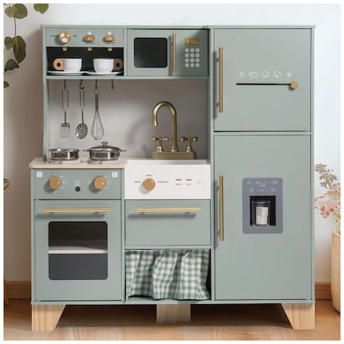 Crie um espaço de brincadeira requintado com esta cozinha de canto verde para crianças, com puxadores dourados e acessórios elegantes. As bordas suaves e utensílios leves e duráveis garantem a segurança das crianças. Todos os produtos e acessórios possuem superfícies lisas e sem rebarbas, permitindo que as crianças brinquem felizes e em segurança. Projetada com pegas ocas dos dois lados, esta cozinha é fácil de mover e pode ser colocada em qualquer lugar da casa. Com recursos diversificados que incluem geladeira, fabricador de gelo, cafeteira, espremedor, micro-ondas, forno, lava-louças e uma variedade de utensílios e xícaras de café, esta cozinha se torna um centro de criatividade e diversão para as crianças! A qualidade excepcional é uma marca constante da marca ROBUD, refletindo seu compromisso com a excelência e a artesanía requintada. Cada detalhe é meticulosamente projetado e rigorosamente selecionado para garantir durabilidade e experiência do usuário ideais para nossos produtos. Apesar de possuir muitos recursos divertidos, este produto é super fácil de montar! As instruções simples e claras facilitam a montagem rápida, para que as crianças possam mergulhar rapidamente na brincadeira. Este conjunto de cozinha de brinquedo é um presente emocionante para qualquer ocasião! Seja para feriado, aniversário ou apenas porque sim, seu design fofo e encantador cativará as crianças, estimulando a imaginação e ajudando a criar momentos maravilhosos de diversão e brincadeira.