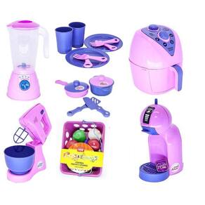Esse kit incrível inclui uma air fryer, batedeira, panelas com tampas e talheres, copos, pratos, cafeteira, liquidificador, cestinha com frutas e legumes, além de muitos outros utensílios.