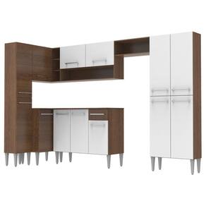 - Seis módulos independentes: paneleiro com duas portas; balcão de canto reto; armário aéreo de canto reto com duas portas e adega; balcão de pia; armário aéreo com duas portas e dois nichos; paneleiro duplo com quatro portas.