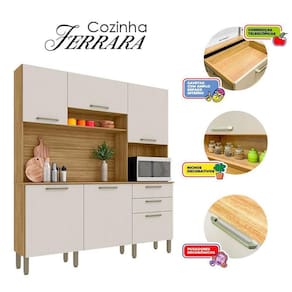 Está montando sua cozinha? Então apresentamos para você esta bela cozinha da linha Ferrara. Com seis portas, sendo uma basculante, entrega um ótimo espaço interno. Conta com duas gavetas, ideais para você guardar seus acessórios, além dos três nichos que são perfeitos para acomodar seus objetos e eletrodomésticos. Os pés reguláveis em plástico resistente garantem a estabilidade, ajustando-se ao nível do piso. Fabricado pela Kits Paraná, desenvolvido em MDP, combina durabilidade, design moderno e otimização de espaço, sendo ótima solução para quem busca modernidade e funcionalidade. Confira e aproveite!