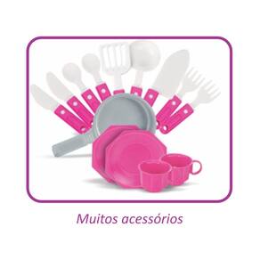 Além de possuir fogão, forno, pia, micro-ondas, geladeira e diversos acessórios, a brincadeira fica ainda mais divertida porque a torneira sai água de verdade, tornando a experiência muito mais realista. Um brinquedo lúdico, colorido e cheio de encanto, que garante horas de diversão e aprendizado para os pequenos chefs.
