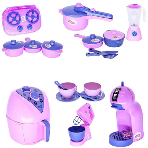O kit vem com fogão cooktop air fryer batedeira liquidificador cafeteira com cápsula panela de pressão xícara com pires e colher jogo de panela com talheres 20pç