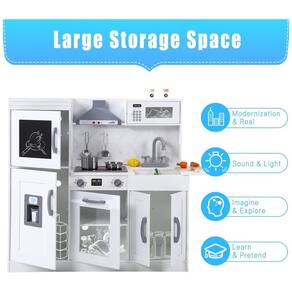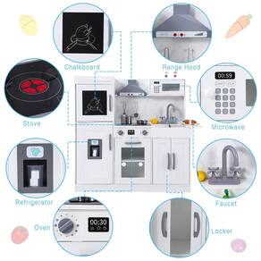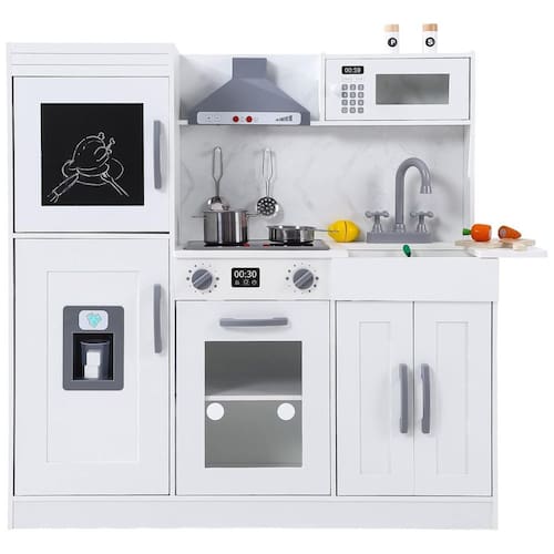 Com funções realistas, como o botão do fogão e do exaustor que acendem e emitem som de cozimento, e o botão da máquina de fazer gelo que faz os cubos caírem, as crianças se divertirão muito com este conjunto. Além disso, o quadro negro ajuda a gravar receitas e o conjunto inclui um forno, micro ondas, torneira e pia.