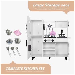 Nossa cozinha interativa para crianças é um brinquedo completo, com elementos que incluem um dispensador alimentado por bateria, um forno de micro ondas e um botão de clique com botões e sons. A estrutura é feita de madeira composta resistente e peças de plástico moldadas, garantindo segurança máxima e a capacidade de suportar anos de desgaste. A cozinha de simulação pode ser montada de forma rápida e fácil, incluindo todas as ferragens e instruções necessárias. O conjunto inclui 7 utensílios, uma escumadeira, uma espátula, uma concha, um escorredor, uma panela, uma panela de sopa, uma toalha isolada e um telefone sem fio, permitindo que as crianças mergulhem em uma aventura imaginativa de culinária. Além disso, a cozinha inclui um forno e prateleira para as crianças guardarem acessórios e outros brinquedos extras que queiram levar para a cozinha. A pequena e leve cozinha lúdica branca pode ser facilmente movida e operada, pesando menos de 18,14 quilos. É ideal para salas de jogos, quartos, creches e salas de aula, com prateleiras e armários embutidos para guardar acessórios.