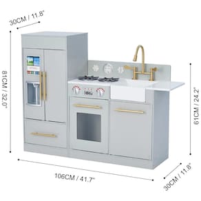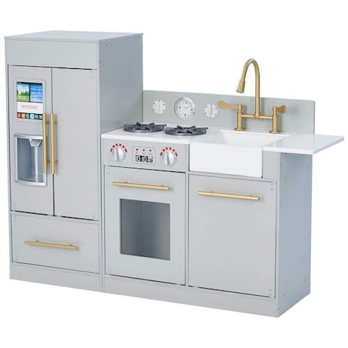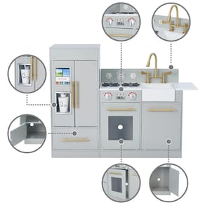 Esta cozinha infantil cinza com detalhes dourados é uma adição elegante para qualquer sala de jogos. Possui eletrodomésticos de estilo contemporâneo, pia e torneira modernas de casa de fazenda e recursos interativos para manter as crianças entretidas. A geladeira possui uma máquina de gelo embutida e vem com 3 cubos de gelo para brincar, enquanto o forno possui botões para clicar e girar. Esta cozinha de madeira é versátil e pode ser configurada de duas formas alinhada lado a lado ou com a geladeira separada do fogão como duas peças independentes, permitindo que se ajuste em qualquer espaço. É feita de madeira projetada, segura para crianças e fácil de limpar quando necessário. Recomendada para crianças a partir de 3 anos, todos os produtos Teamson Kids são certificados e testados em segurança, são livres de grafite e ftalatos usando tinta não tóxica, são compatíveis com CPSIA e atendem aos padrões ASTM F963. A montagem é necessária e as instruções passo a passo e todo o hardware estão incluídos.