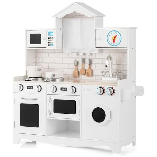 Este conjunto de cozinha infantil Costzon oferece uma experiência culinária realista para as crianças, permitindo que elas brinquem na cozinha enquanto os adultos cozinham em outra. Com eletrodomésticos de mentira, incluindo um botão clicável do fogão, geladeira, micro ondas e máquina de lavar, as crianças podem cozinhar ingredientes de mentira e fingir lavar a louça depois do jantar com a torneira e pia removível. O conjunto também possui grande espaço de armazenamento, com portas que abrem para armazenar alimentos e utensílios de cozinha. Construído em MDF sólido e com tinta adequada para crianças e inodora, este conjunto é durável e seguro para que as crianças possam brincar livremente. Certificado pela ASTM e CPSIA, é perfeito para sala de jogos, quarto, creche ou sala de aula. Este conjunto de jogos de cozinha é um presente ideal para as crianças, proporcionando inúmeras oportunidades para brincadeiras interativas e imaginativas, permitindo que duas crianças cozinhem juntas para cooperar e compartilhar a felicidade.
